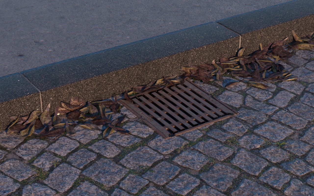 113-公路边的下水道和树叶场景C4D VRAY模型