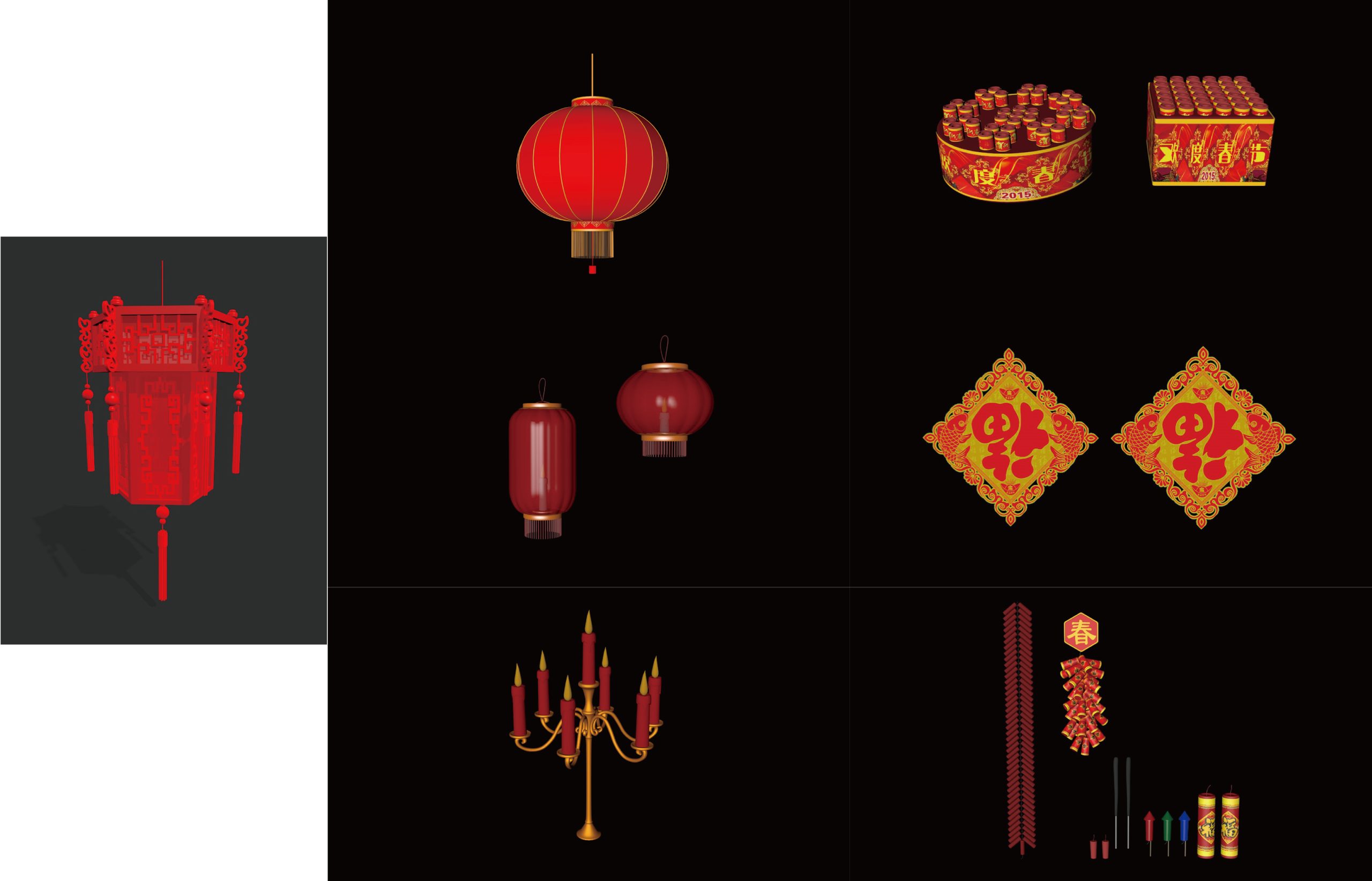 161-7个 古风 中国风 宫灯 福字 红蜡烛 鞭炮 灯笼元素