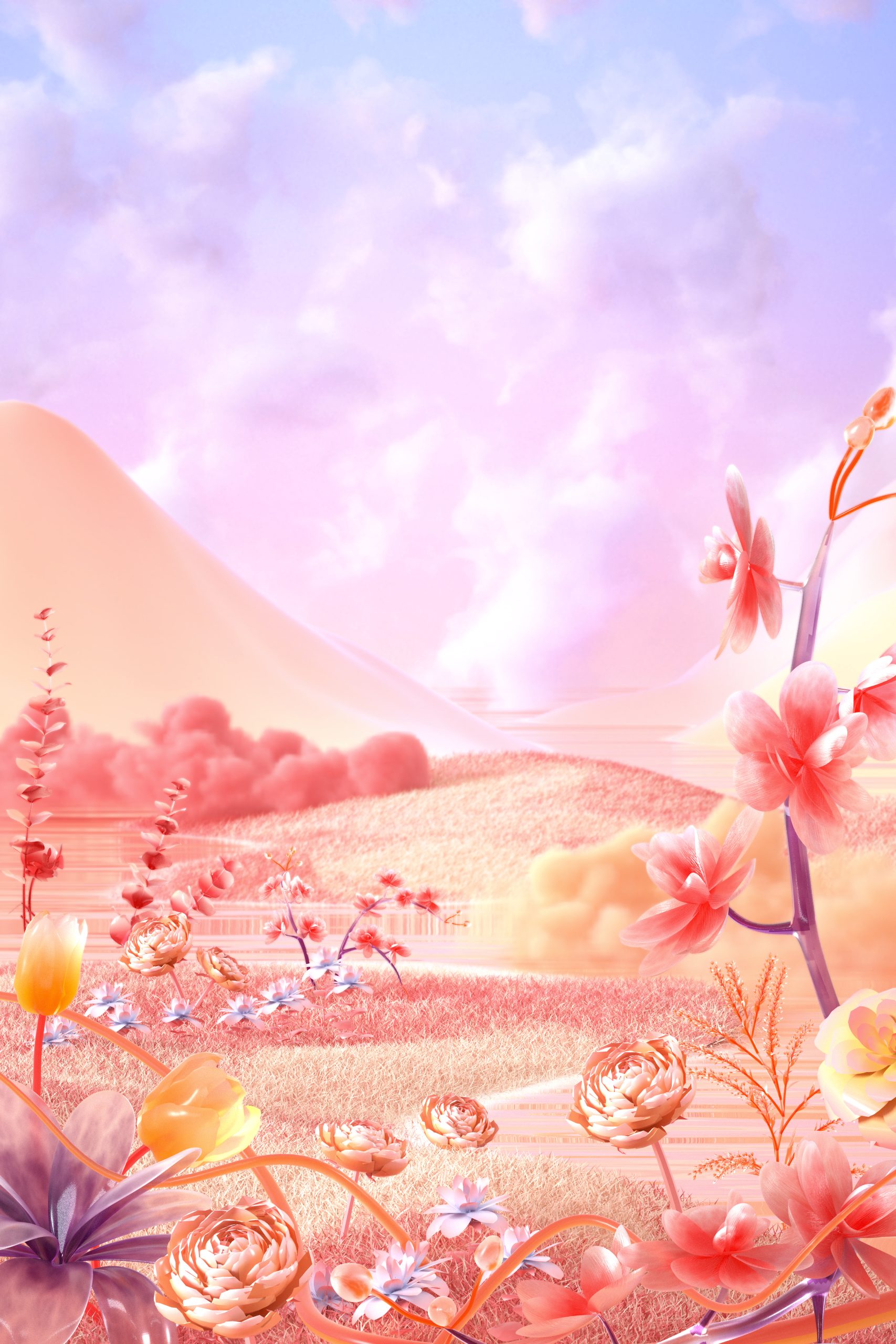 45-3D立体C4D粉色唯美梦幻春天春季花朵毛绒草地场景